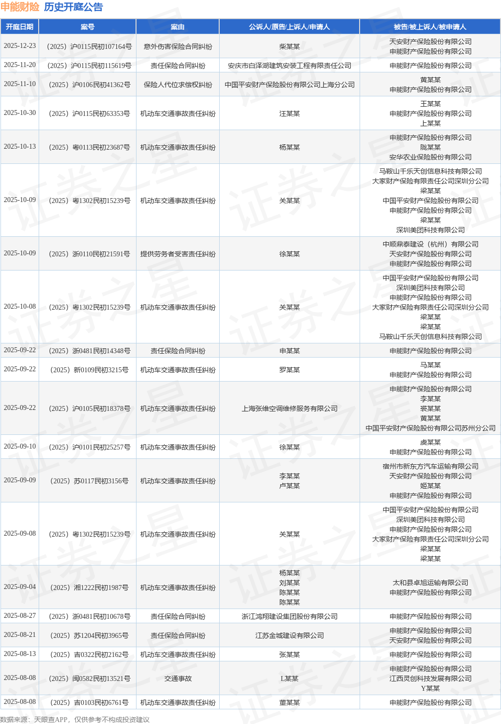 案号:(2025)浙0110民初21591号根据统计,近一年内以申能财产保险股份有限公司为当事人的历史开庭公告有59则,其中案由为“机动车交通事故责任纠纷”的公告以37则居首,其次为“责任保险合同纠纷”有6则,“非机动车交通事故责任纠纷”有4则。历史开庭公告(前20条)如下: