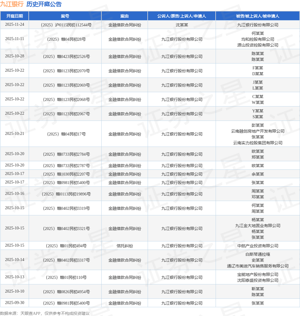 案号:(2025)赣0826民初4954号根据统计,近一年内以九江银行股份有限公司为当事人的历史开庭公告有780则,其中案由为“金融借款合同纠纷”的公告以688则居首,其次为“借款”有66则,“房屋买卖合同纠纷”有6则。历史开庭公告(前20条)如下: