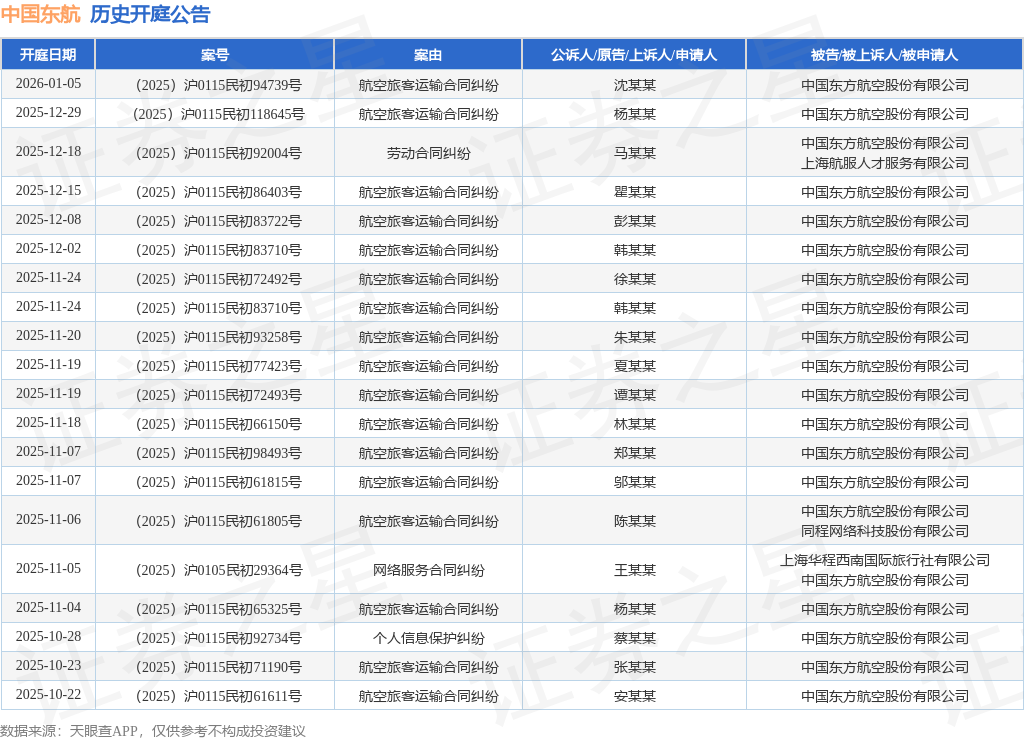 案号:(2025)沪0115民初77415号根据统计,近一年内以中国东方航空股份有限公司为当事人的历史开庭公告有163则,其中案由为“航空旅客运输合同纠纷”的公告以111则居首,其次为“生命权、身体权、健康权纠纷”有9则,“网络服务合同纠纷”有7则。历史开庭公告(前20条)如下: