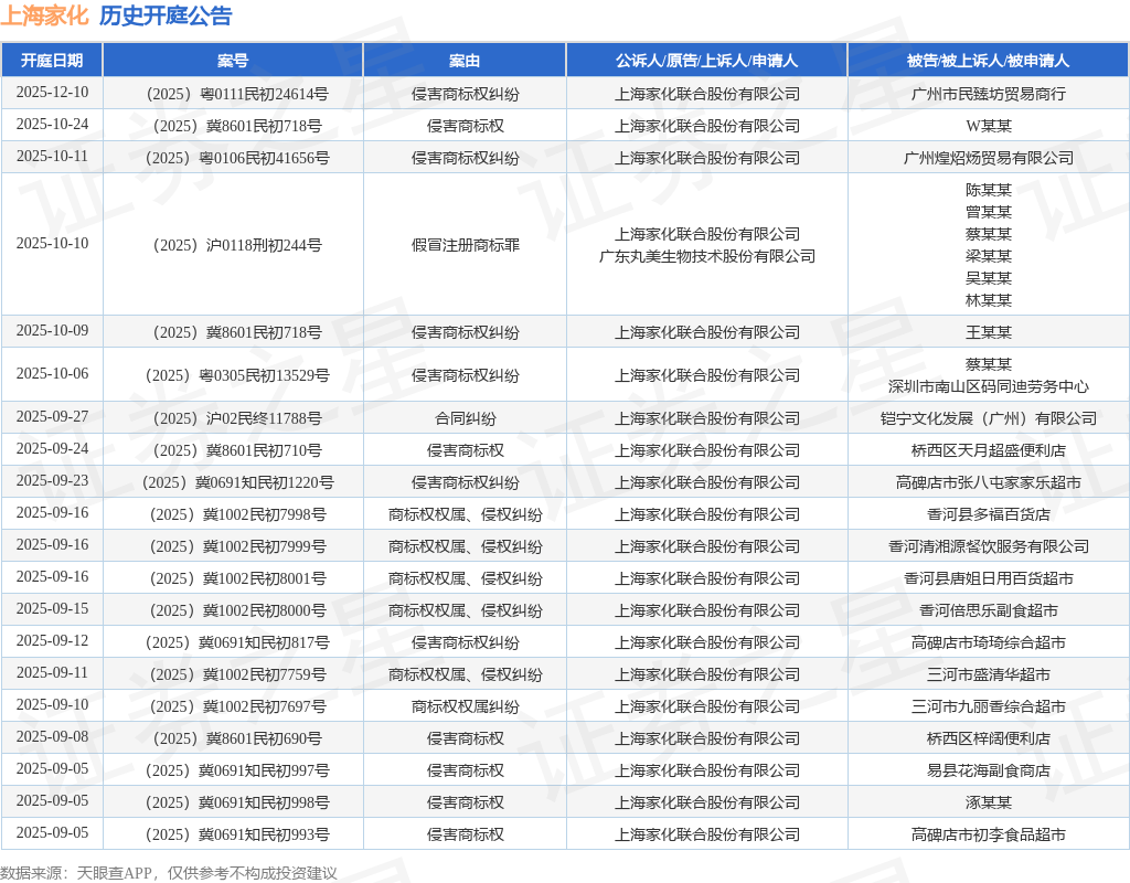 案号:(2025)沪0118刑初244号根据统计,近一年内以上海家化联合股份有限公司为当事人的历史开庭公告有543则,其中案由为“侵害商标权纠纷”的公告以395则居首,其次为“侵害商标权”有61则,“商标权权属、侵权纠纷”有49则。历史开庭公告(前20条)如下: