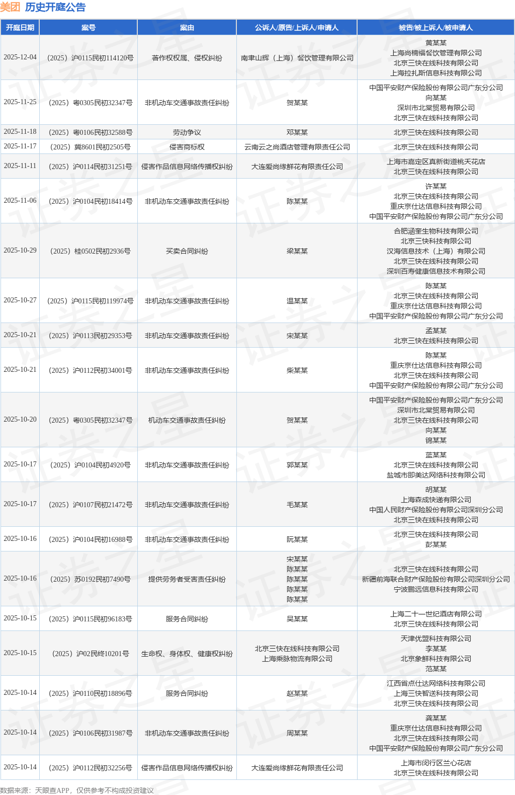 案号:(2025)沪0109民初12152号根据统计,近一年内以北京三快在线科技有限公司为当事人的历史开庭公告有484则,其中案由为“非机动车交通事故责任纠纷”的公告以143则居首,其次为“劳动争议”有56则,“机动车交通事故责任纠纷”有55则。历史开庭公告(前20条)如下: