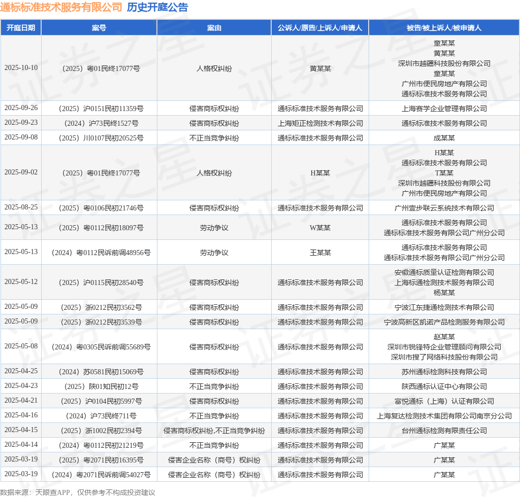 案号:(2025)粤01民终17077号根据统计,近一年内以通标标准技术服务有限公司为当事人的历史开庭公告有28则,其中案由为“侵害商标权纠纷”的公告以13则居首,其次为“不正当竞争纠纷”有6则,“人格权纠纷”有3则。历史开庭公告(前20条)如下:
