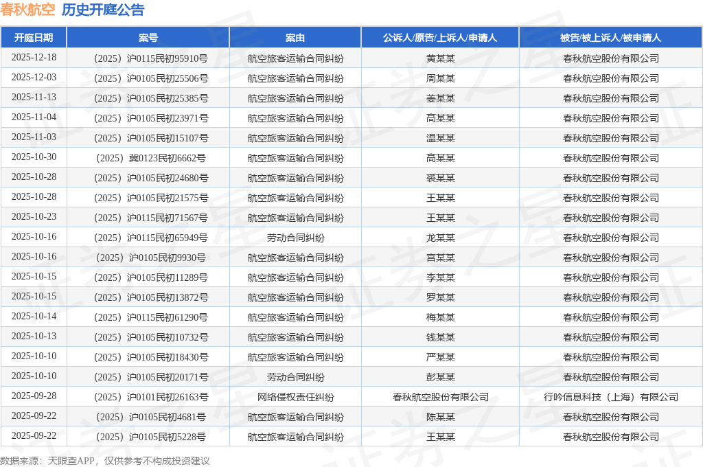 案号:(2025)沪0105民初20171号根据统计,近一年内以春秋航空股份有限公司为当事人的历史开庭公告有100则,其中案由为“航空旅客运输合同纠纷”的公告以58则居首,其次为“网络服务合同纠纷”有16则,“劳动合同纠纷”有12则。历史开庭公告(前20条)如下: