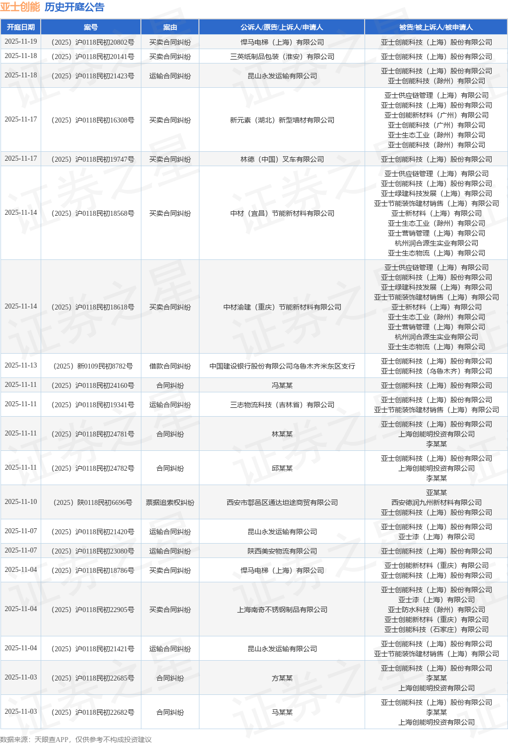 案号:(2025)沪0118民初18797号根据统计,近一年内以亚士创能科技(上海)股份有限公司为当事人的历史开庭公告有130则,其中案由为“买卖合同纠纷”的公告以39则居首,其次为“运输合同纠纷”有21则,“追偿权纠纷”有16则。历史开庭公告(前20条)如下: