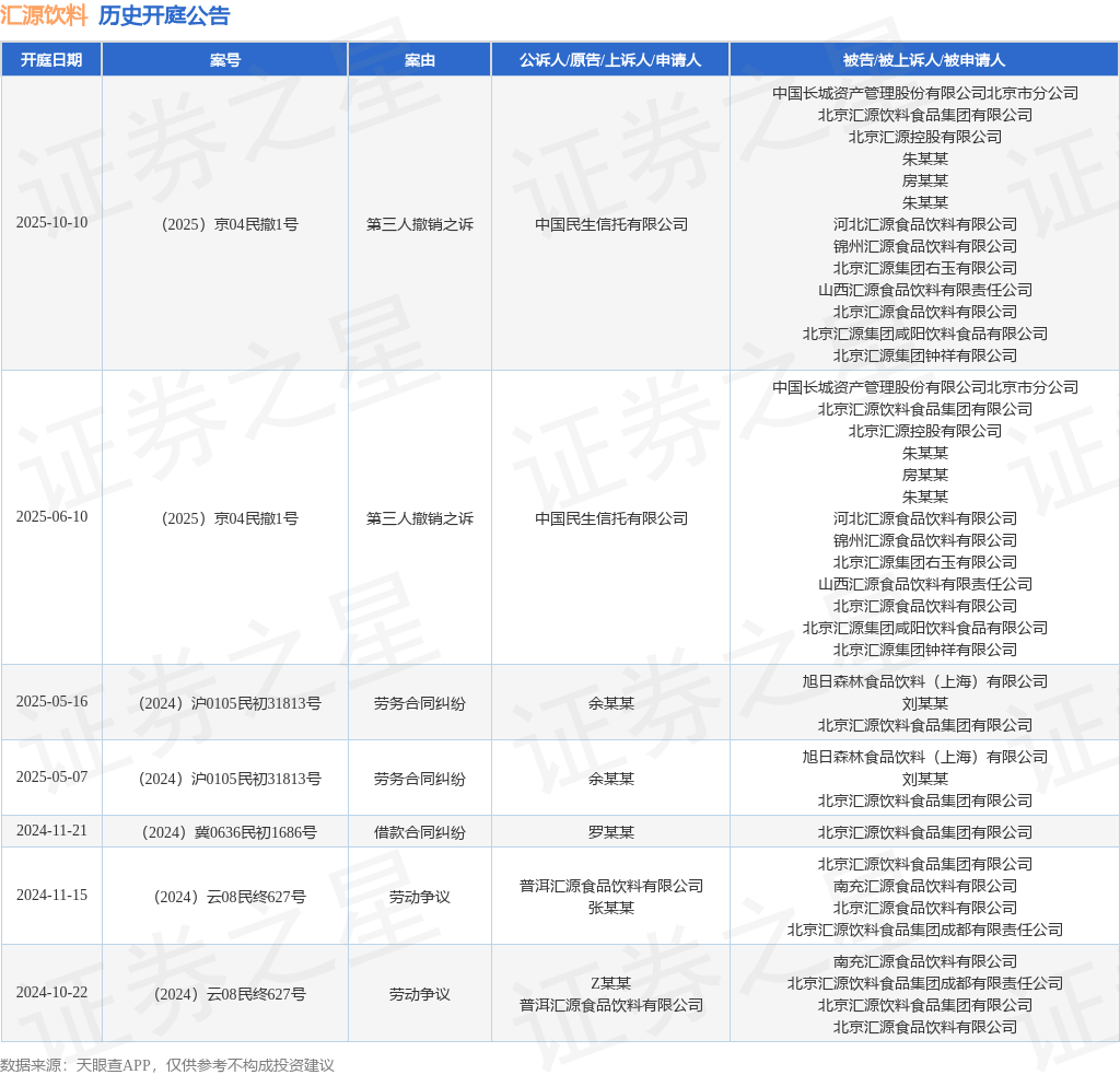 根据统计,近一年内以北京汇源饮料食品集团有限公司为当事人的历史开庭公告有7则,其中案由为“劳务合同纠纷”的公告以2则居首,其次为“劳动争议”有2则,“第三人撤销之诉”有2则。历史开庭公告如下: