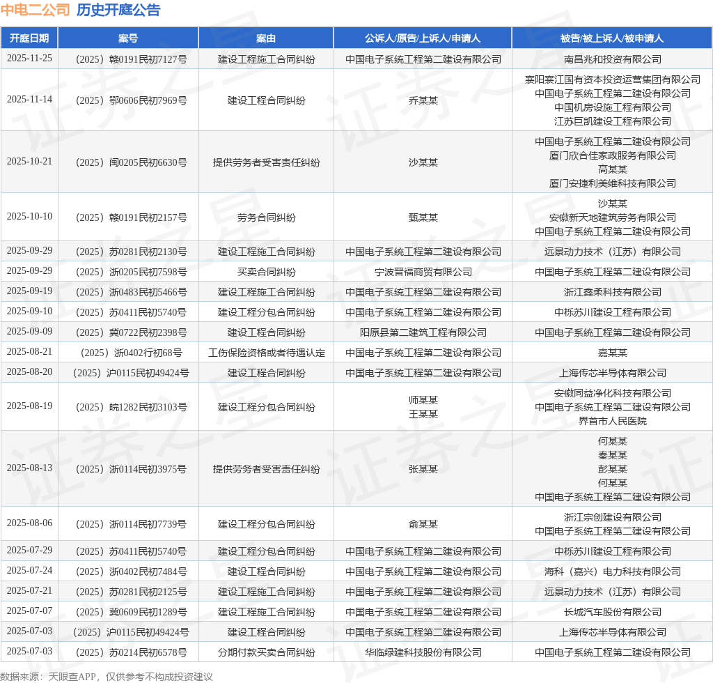 案号:(2025)赣0191民初2157号根据统计,近一年内以中国电子系统工程第二建设有限公司为当事人的历史开庭公告有209则,其中案由为“追索劳动报酬纠纷”的公告以61则居首,其次为“分期付款买卖合同纠纷”有52则,“建设工程施工合同纠纷”有24则。历史开庭公告(前20条)如下: