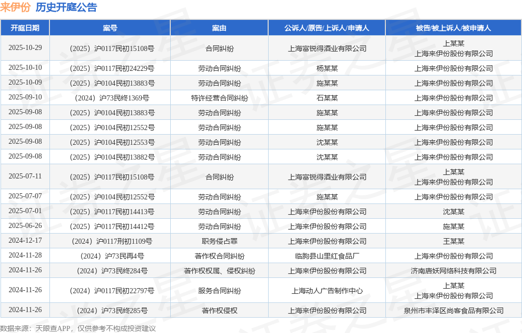 根据统计,近一年内以上海来伊份股份有限公司为当事人的历史开庭公告有17则,其中案由为“劳动合同纠纷”的公告以9则居首,其次为“合同纠纷”有2则,“服务合同纠纷”有1则。历史开庭公告如下: