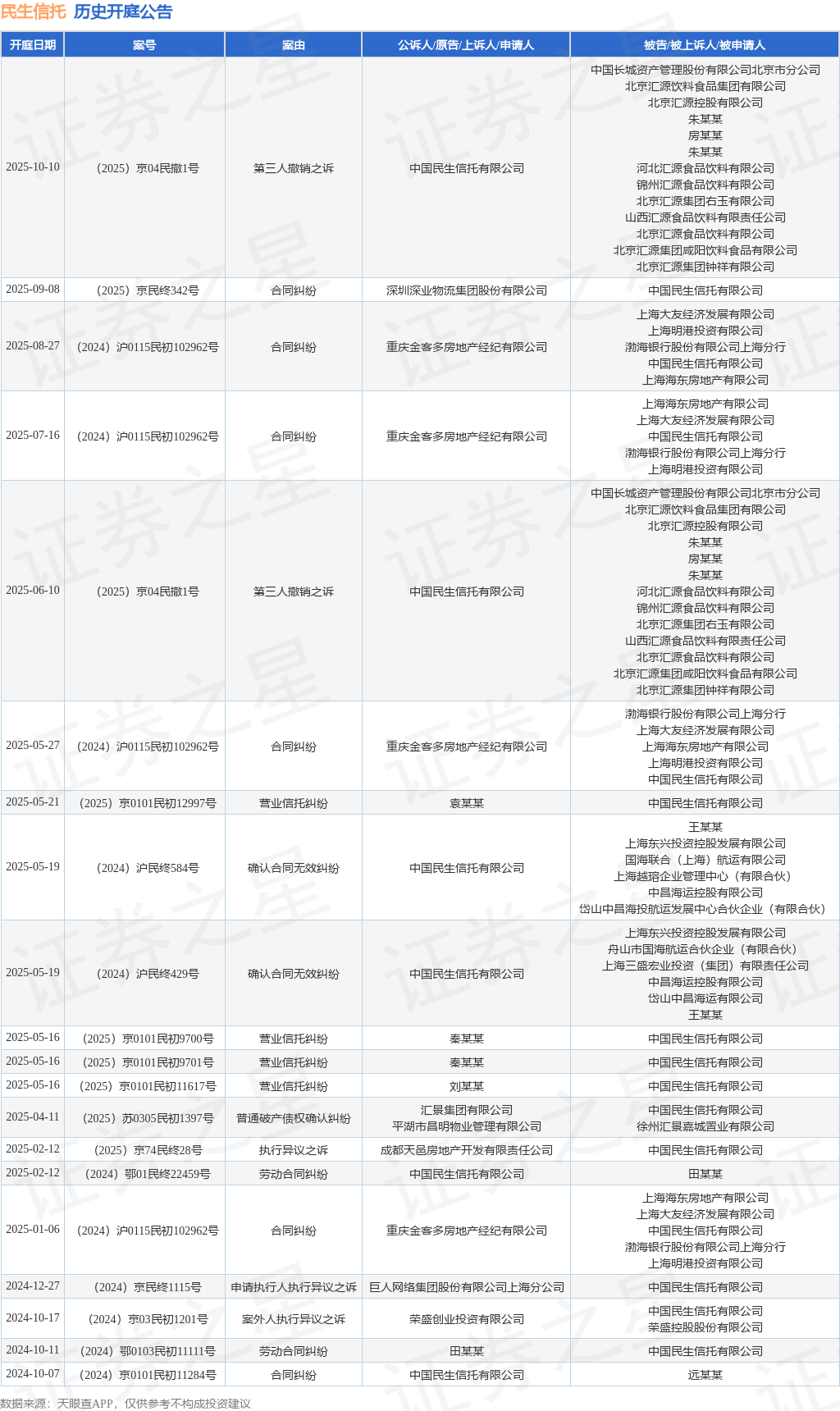 根据统计,近一年内以中国民生信托有限公司为当事人的历史开庭公告有20则,其中案由为“合同纠纷”的公告以6则居首,其次为“营业信托纠纷”有4则,“劳动合同纠纷”有2则。历史开庭公告如下: