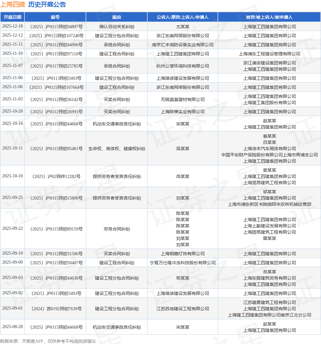 案号:(2025)沪02民终12282号根据统计,近一年内以上海建工四建集团有限公司为当事人的历史开庭公告有164则,其中案由为“买卖合同纠纷”的公告以41则居首,其次为“建设工程分包合同纠纷”有26则,“建设工程施工合同纠纷”有17则。历史开庭公告(前20条)如下: