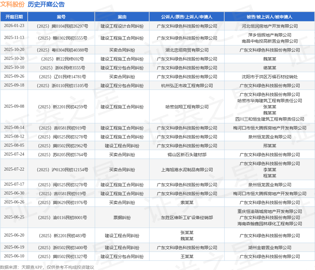 案号:(2025)浙06民终3555号根据统计,近一年内以广东文科绿色科技股份有限公司为当事人的历史开庭公告有128则,其中案由为“建设工程施工合同纠纷”的公告以43则居首,其次为“买卖合同纠纷”有18则,“劳务合同纠纷”有16则。历史开庭公告(前20条)如下: