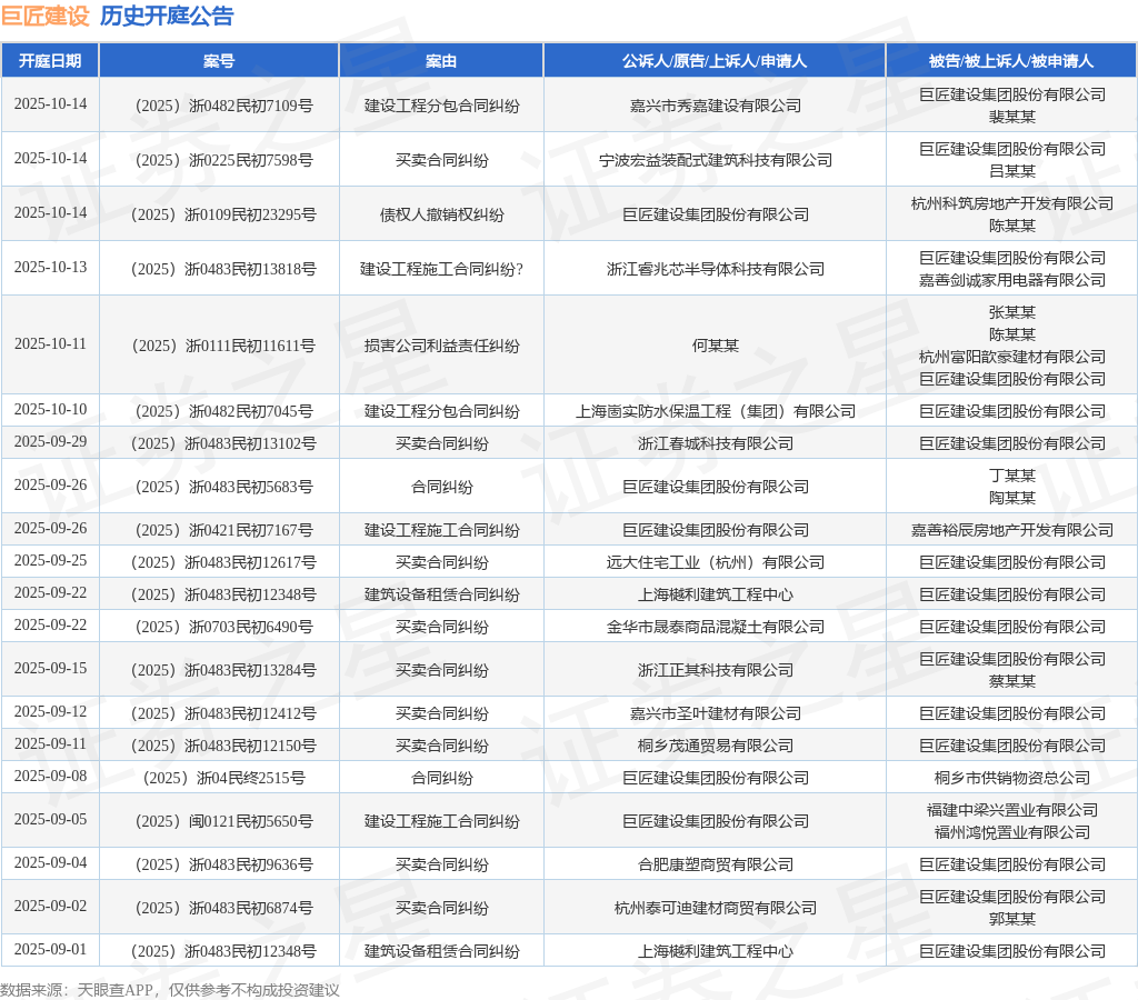 案号:(2025)浙0482民初7045号根据统计,近一年内以巨匠建设集团股份有限公司为当事人的历史开庭公告有243则,其中案由为“买卖合同纠纷”的公告以82则居首,其次为“合同纠纷”有38则,“建设工程施工合同纠纷”有35则。历史开庭公告(前20条)如下: