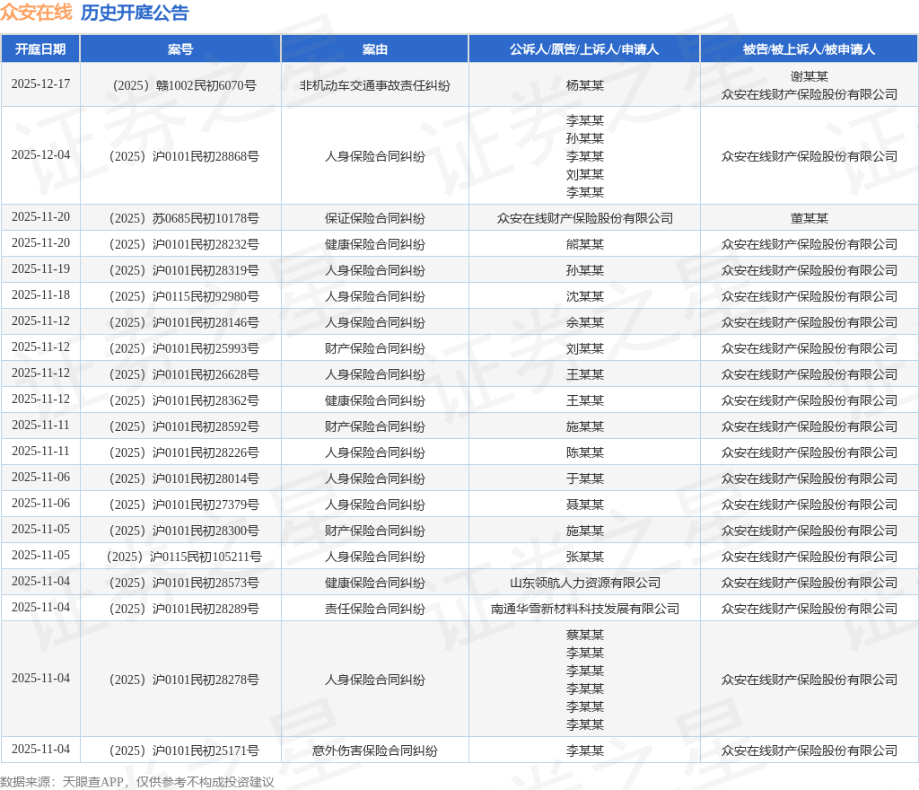 案号:(2025)沪0101民初26878号根据统计,近一年内以众安在线财产保险股份有限公司为当事人的历史开庭公告有4842则,其中案由为“保证保险合同纠纷”的公告以3040则居首,其次为“人身保险合同纠纷”有664则,“保险人代位求偿权纠纷”有287则。历史开庭公告(前20条)如下: