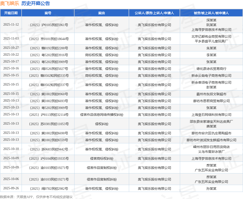 案号:(2025)浙0683民初9442号根据统计,近一年内以奥飞娱乐股份有限公司为当事人的历史开庭公告有464则,其中案由为“著作权权属、侵权纠纷”的公告以230则居首,其次为“侵害作品发行权纠纷”有58则,“侵害作品信息网络传播权纠纷”有30则。历史开庭公告(前20条)如下: