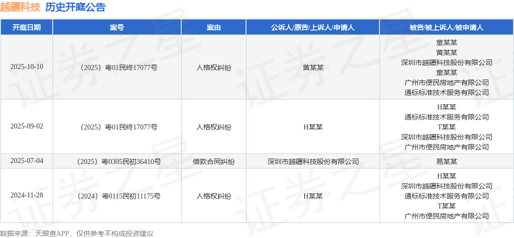 根据统计,近一年内以深圳市越疆科技股份有限公司为当事人的历史开庭公告有4则,其中案由为“人格权纠纷”的公告以3则居首,其次为“借款合同纠纷”有1则。历史开庭公告如下: