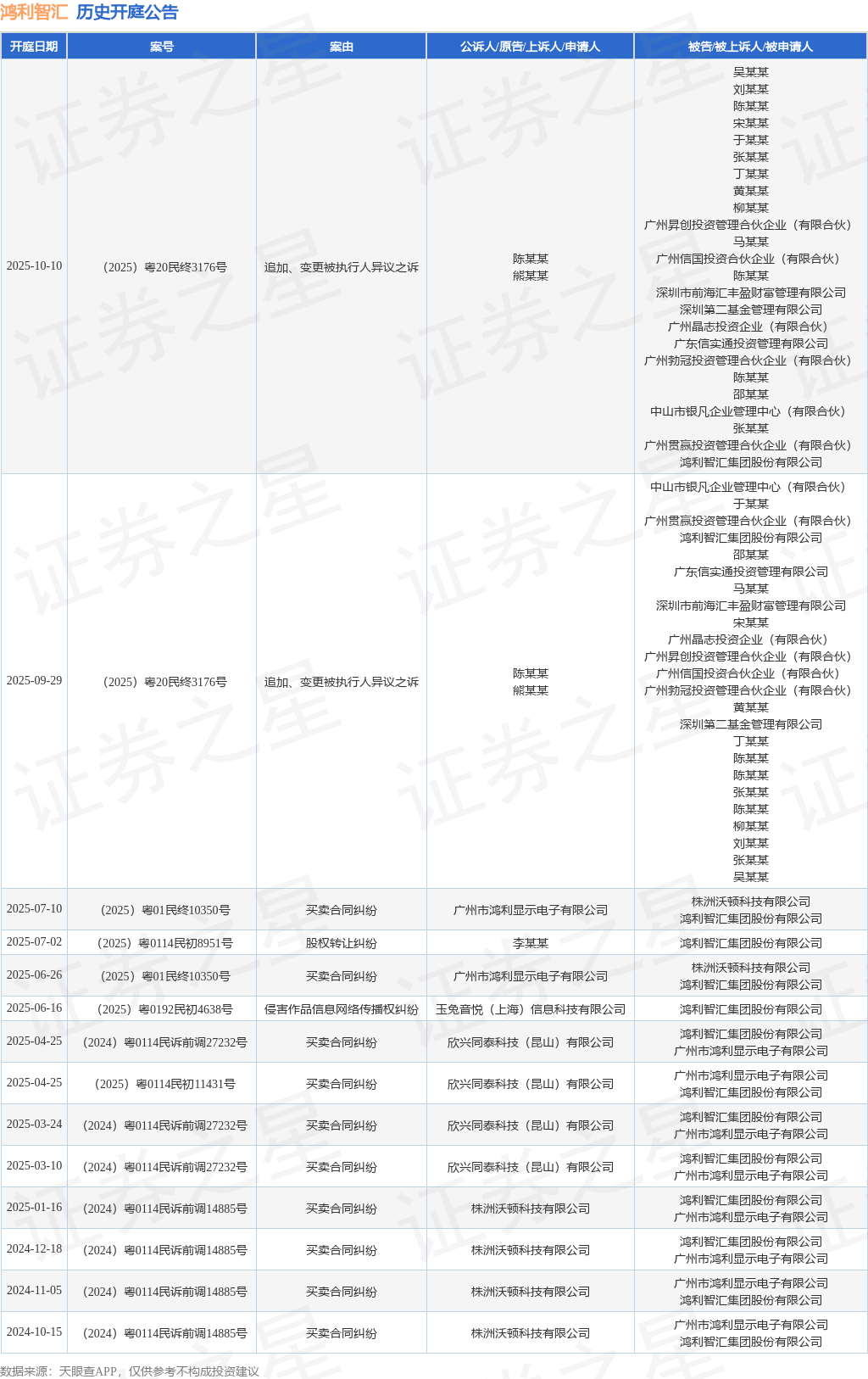 根据统计,近一年内以鸿利智汇集团股份有限公司为当事人的历史开庭公告有14则,其中案由为“买卖合同纠纷”的公告以10则居首,其次为“追加、变更被执行人异议之诉”有2则,“侵害作品信息网络传播权纠纷”有1则。历史开庭公告如下: