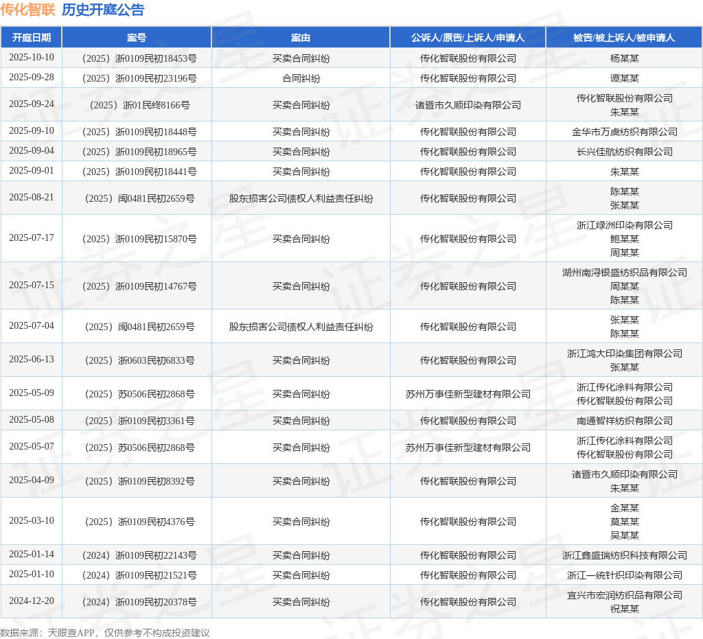 案号:(2025)浙0109民初18453号根据统计,近一年内以传化智联股份有限公司为当事人的历史开庭公告有19则,其中案由为“买卖合同纠纷”的公告以16则居首,其次为“股东损害公司债权人利益责任纠纷”有2则,“合同纠纷”有1则。历史开庭公告如下: