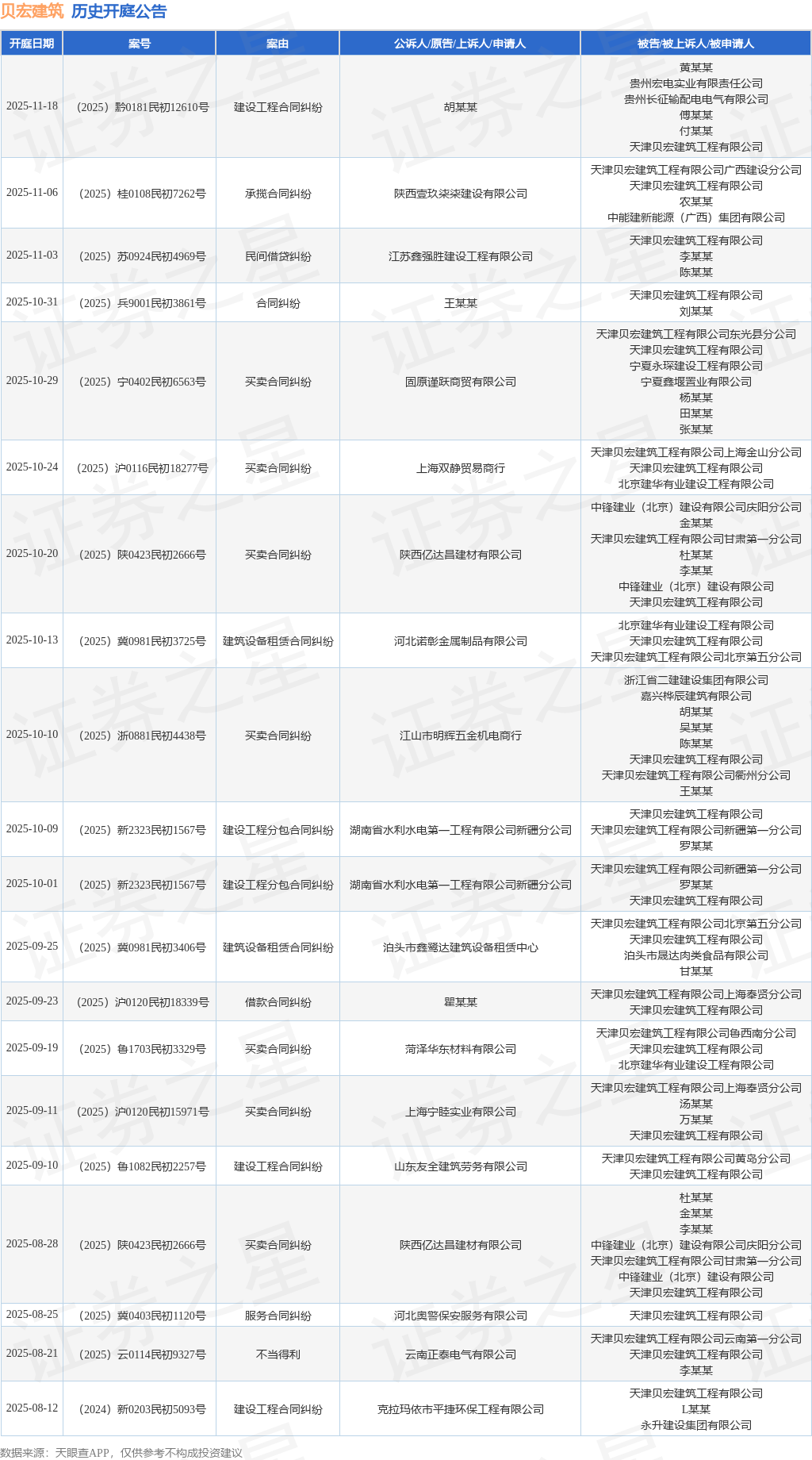 案号:(2025)浙0881民初4438号根据统计,近一年内以天津贝宏建筑工程有限公司为当事人的历史开庭公告有76则,其中案由为“买卖合同纠纷”的公告以21则居首,其次为“建设工程施工合同纠纷”有15则,“建设工程合同纠纷”有11则。历史开庭公告(前20条)如下: