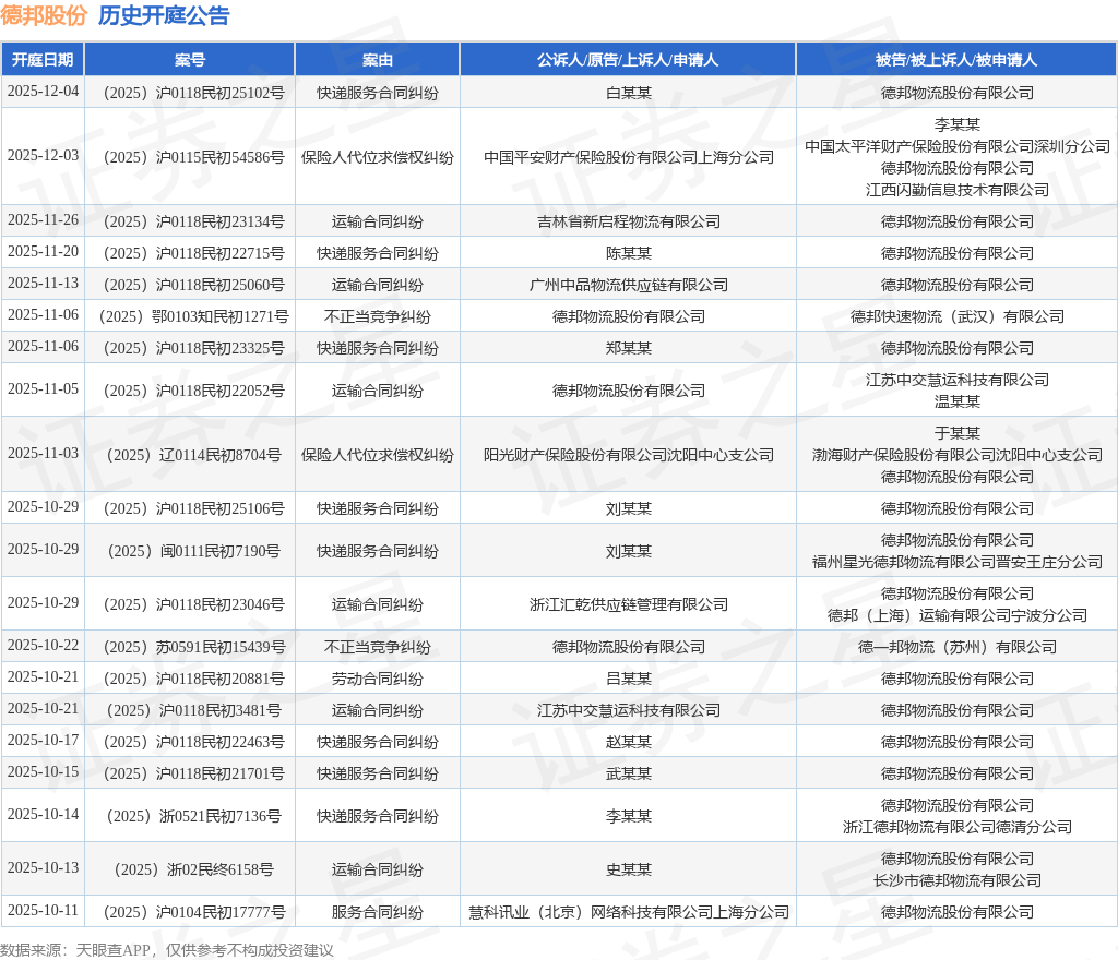 案号:(2025)沪0104民初17777号根据统计,近一年内以德邦物流股份有限公司为当事人的历史开庭公告有404则,其中案由为“快递服务合同纠纷”的公告以132则居首,其次为“运输合同纠纷”有80则,“劳动争议”有28则。历史开庭公告(前20条)如下: