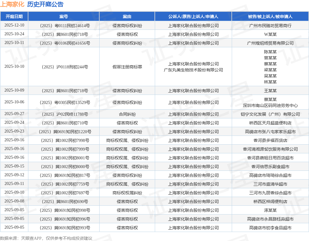 案号:(2025)粤0106民初41656号根据统计,近一年内以上海家化联合股份有限公司为当事人的历史开庭公告有543则,其中案由为“侵害商标权纠纷”的公告以395则居首,其次为“侵害商标权”有61则,“商标权权属、侵权纠纷”有49则。历史开庭公告(前20条)如下: