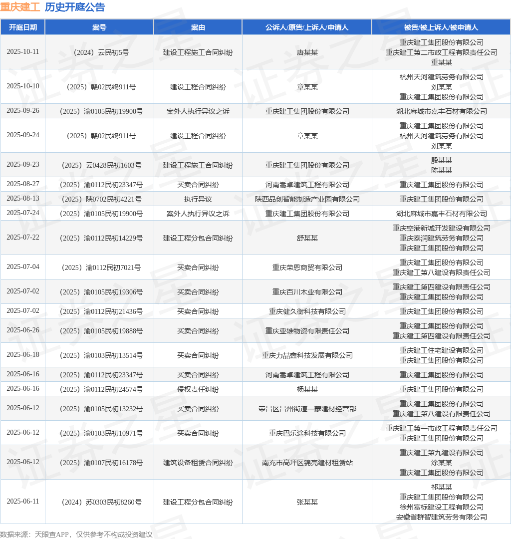 案号:(2024)云民初5号根据统计,近一年内以重庆建工集团股份有限公司为当事人的历史开庭公告有490则,其中案由为“买卖合同纠纷”的公告以188则居首,其次为“劳务合同纠纷”有63则,“建设工程施工合同纠纷”有48则。历史开庭公告(前20条)如下: