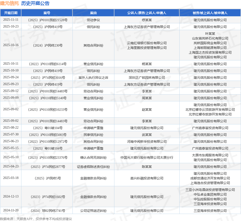 证券之星消息,根据天眼查APP显示,近日公布了一则建元信托股份有限公司作为被告/被上诉人的开庭公告,详细内容如下: