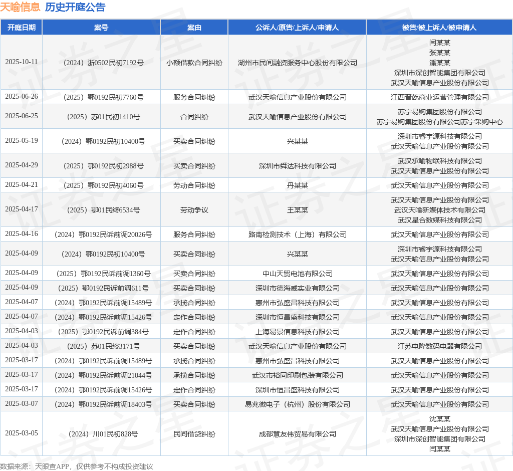 证券之星消息,根据天眼查APP显示,近日公布了一则武汉天喻信息产业股份有限公司作为被告/被上诉人的开庭公告,详细内容如下: