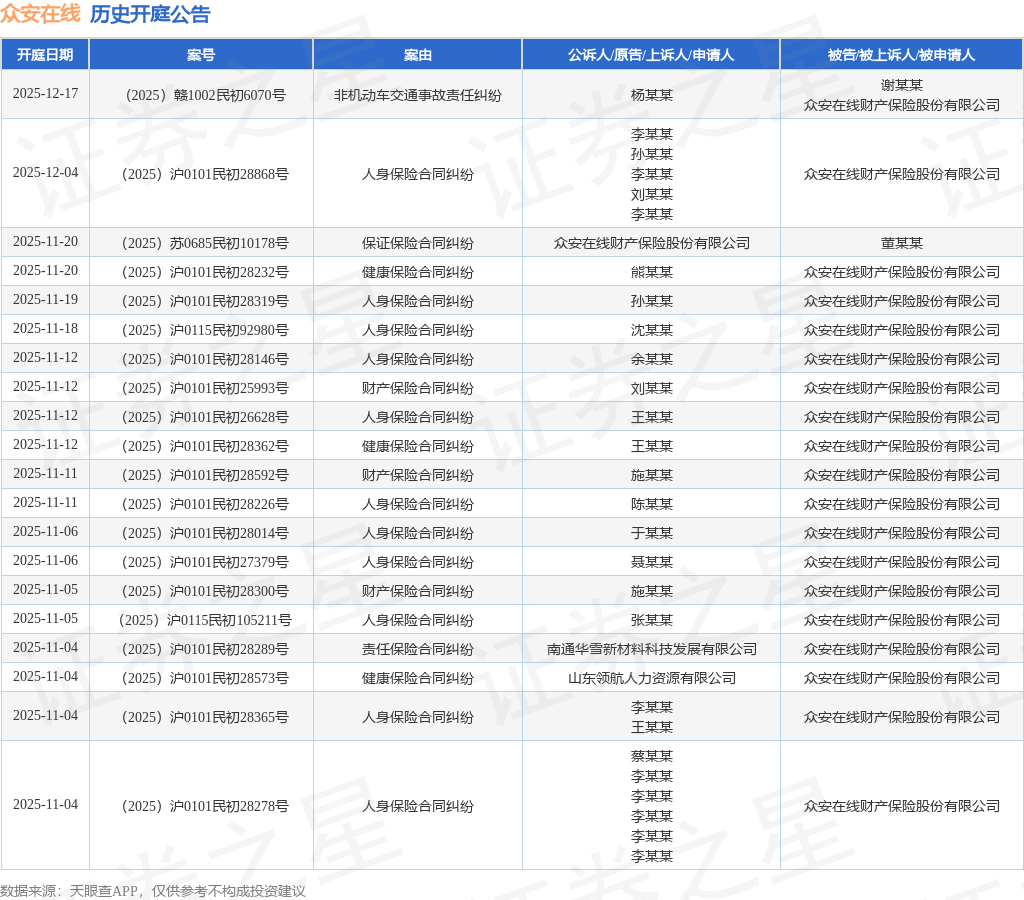 案号:(2025)沪0101民初20606号根据统计,近一年内以众安在线财产保险股份有限公司为当事人的历史开庭公告有4856则,其中案由为“保证保险合同纠纷”的公告以3040则居首,其次为“人身保险合同纠纷”有671则,“保险人代位求偿权纠纷”有287则。历史开庭公告(前20条)如下: