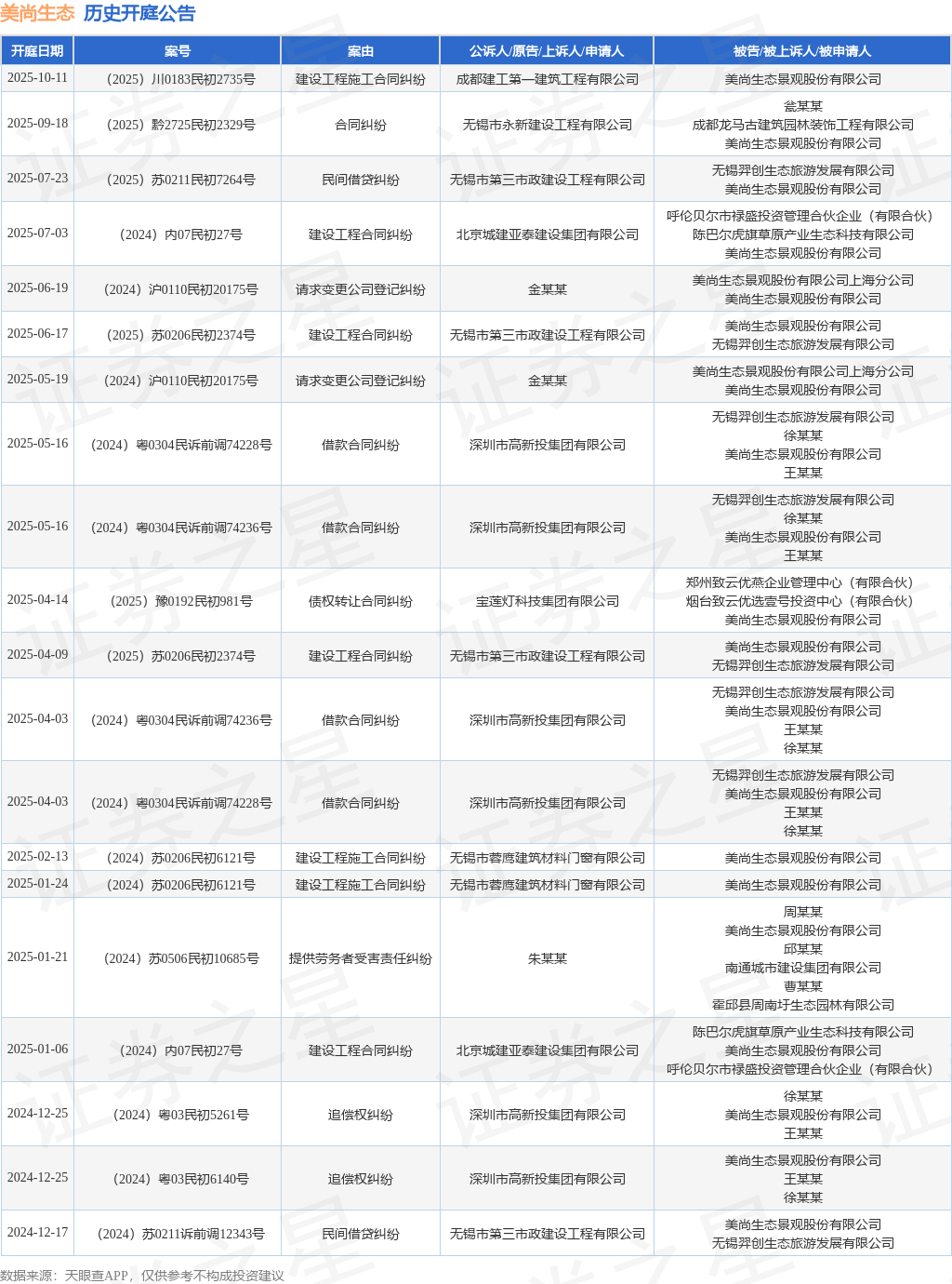 案号:(2025)川0183民初2735号根据统计,近一年内以美尚生态景观股份有限公司为当事人的历史开庭公告有32则,其中案由为“建设工程施工合同纠纷”的公告以8则居首,其次为“建设工程合同纠纷”有5则,“借款合同纠纷”有4则。历史开庭公告(前20条)如下: