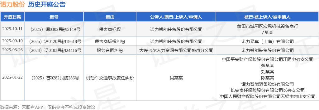 案号:(2025)闽0302民初5149号根据统计,近一年内以诺力智能装备股份有限公司为当事人的历史开庭公告有4则,其中案由为“侵害商标权”的公告以1则居首,其次为“侵害商标权纠纷”有1则,“服务合同纠纷”有1则。历史开庭公告如下: