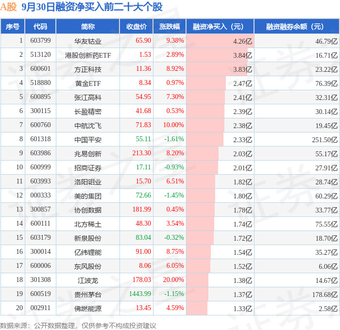 A股融资净买入前三分别为:华友钴业(603799)融资净买入4.26亿元、港股创新药ETF(513120)融资净买入3.84亿元、方正科技(600601)融资净买入3.83亿元,前20具体见下表: