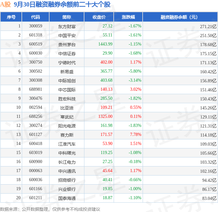 A股融资融券余额前三分别为:东方财富(300059)融资融券余额271.21亿元、中国平安(601318)融资融券余额251.5亿元、贵州茅台(600519)融资融券余额178.68亿元,前20具体见下表:
