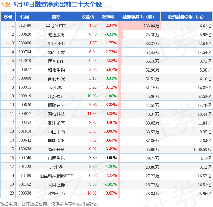 A股融券净卖出前三分别为:半导体ETF(512480)融券净卖出733.04万股、隧道股份(600820)融券净卖出75.3万股、科创50ETF(588000)融券净卖出66.37万股,前20具体见下表: