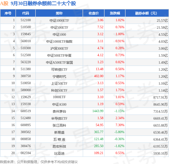 A股融券余额前三分别为:中证1000ETF(512100)融券余额25.57亿元、中证500ETF(510500)融券余额21.58亿元、中证1000(159845)融券余额4.55亿元,前20具体见下表:
