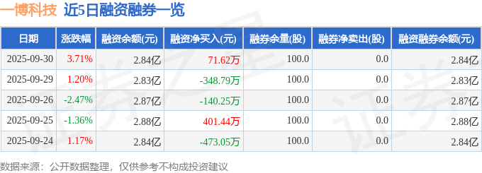 一博科技融资融券信息显示,融资方面,当日融资买入3980.32万元,融资偿还3908.71万元,融资净买入71.62万元。融券方面,融券卖出0.0股,融券偿还0.0股,融券余量100.0股,融券余额0.4万元。融资融券余额2.84亿元。
