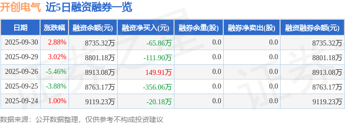 开创电气融资融券信息显示,融资方面,当日融资买入949.93万元,融资偿还1015.79万元,融资净偿还65.86万元。融券方面,融券卖出0.0股,融券偿还0.0股,融券余量0.0股,融券余额0.0万元。融资融券余额8735.32万元。