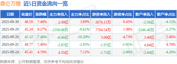 证券之星消息,截至2025年9月30日收盘,昆仑万维(300418)报收于48.59元,上涨7.4%,换手率10.33%,成交量129.63万手,成交额62.22亿元。