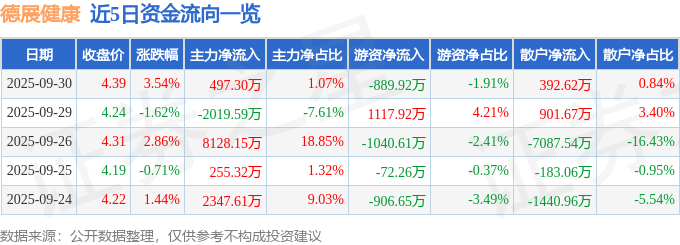 证券之星消息,截至2025年9月30日收盘,德展健康(000813)报收于4.39元,上涨3.54%,换手率5.02%,成交量105.15万手,成交额4.66亿元。