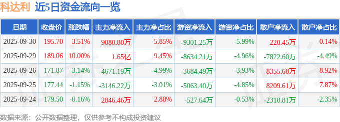 证券之星消息,截至2025年9月30日收盘,科达利(002850)报收于195.7元,上涨3.51%,换手率4.04%,成交量7.96万手,成交额15.52亿元。
