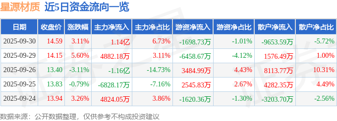 证券之星消息,截至2025年9月30日收盘,星源材质(300568)报收于14.59元,上涨3.11%,换手率9.6%,成交量116.51万手,成交额16.87亿元。