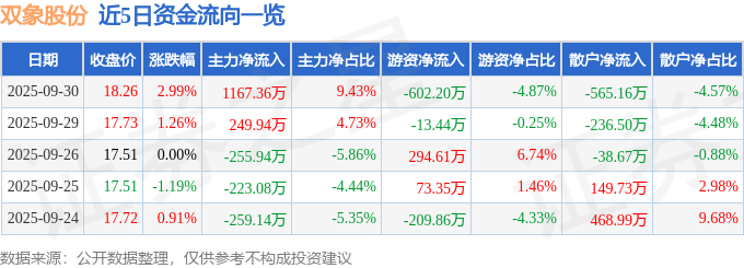 证券之星消息,截至2025年9月30日收盘,双象股份(002395)报收于18.26元,上涨2.99%,换手率2.52%,成交量6.76万手,成交额1.24亿元。