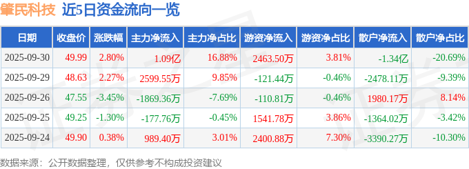 证券之星消息,截至2025年9月30日收盘,肇民科技(301000)报收于49.99元,上涨2.8%,换手率5.66%,成交量12.97万手,成交额6.46亿元。