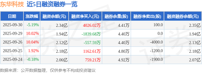 东华科技融资融券信息显示,融资方面,当日融资买入1.2亿元,融资偿还7998.09万元,融资净买入4026.02万元。融券方面,融券卖出100.0股,融券偿还0.0股,融券余量4.41万股,融券余额56.45万元。融资融券余额2.35亿元。