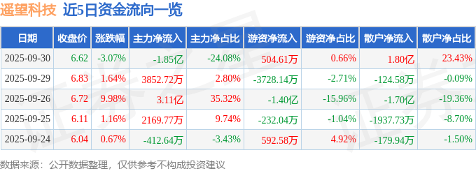 证券之星消息,截至2025年9月30日收盘,遥望科技(002291)报收于6.62元,下跌3.07%,换手率13.29%,成交量115.54万手,成交额7.68亿元。