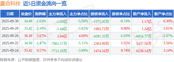 证券之星消息,截至2025年9月30日收盘,赢合科技(300457)报收于34.49元,下跌2.63%,换手率8.23%,成交量52.48万手,成交额18.55亿元。