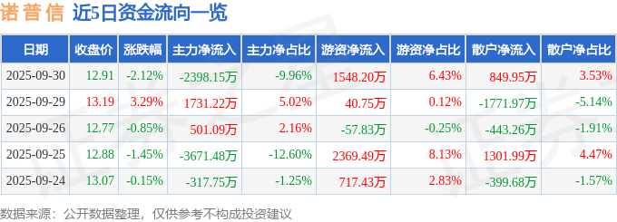 9月30日的资金流向数据方面,主力资金净流出2398.15万元,占总成交额9.96%,游资资金净流入1548.2万元,占总成交额6.43%,散户资金净流入849.95万元,占总成交额3.53%。