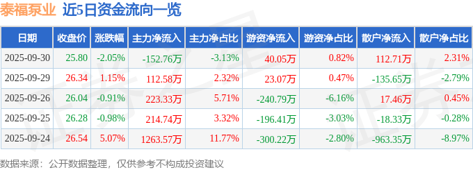 证券之星消息,截至2025年9月30日收盘,泰福泵业(300992)报收于25.8元,下跌2.05%,换手率2.42%,成交量1.87万手,成交额4873.08万元。