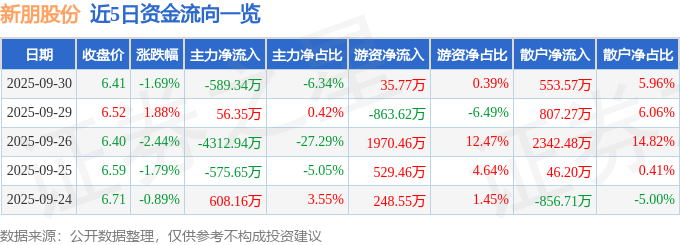 证券之星消息,截至2025年9月30日收盘,新朋股份(002328)报收于6.41元,下跌1.69%,换手率2.52%,成交量14.38万手,成交额9289.41万元。