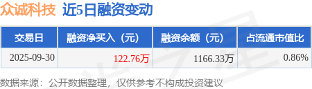 证券之星消息,9月30日,众诚科技(920207)融资买入195.83万元,融资偿还73.07万元,融资净买入122.76万元,融资余额1166.33万元。