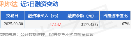 证券之星消息,9月30日,利尔达(920249)融资买入241.73万元,融资偿还194.59万元,融资净买入47.14万元,融资余额3177.42万元。