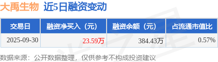 证券之星消息,9月30日,大禹生物(920970)融资买入28.06万元,融资偿还4.47万元,融资净买入23.59万元,融资余额384.43万元。